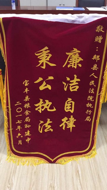 6月5日,申请人孙某将一面写有“秉公执法 廉洁自律”的锦旗送到郏县法院执行法官手中,对法官的高效执行表示感谢。