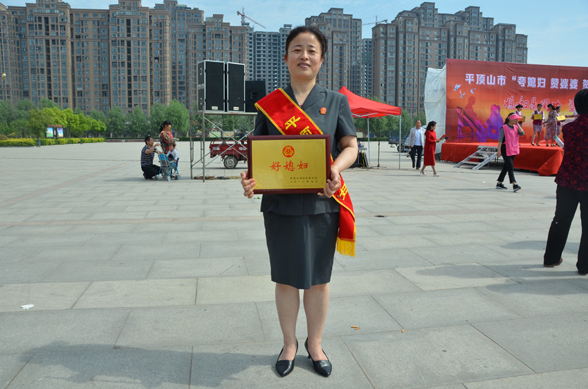 5月10日上午,天朗气清,郏县法院干警孙阿青在郏县三馆广场举行的平顶山市“夸媳妇 赞婆婆 贺娘家” 暨寻找“最美母亲”“最美家庭”活动中,荣获“好媳妇”荣誉称号。