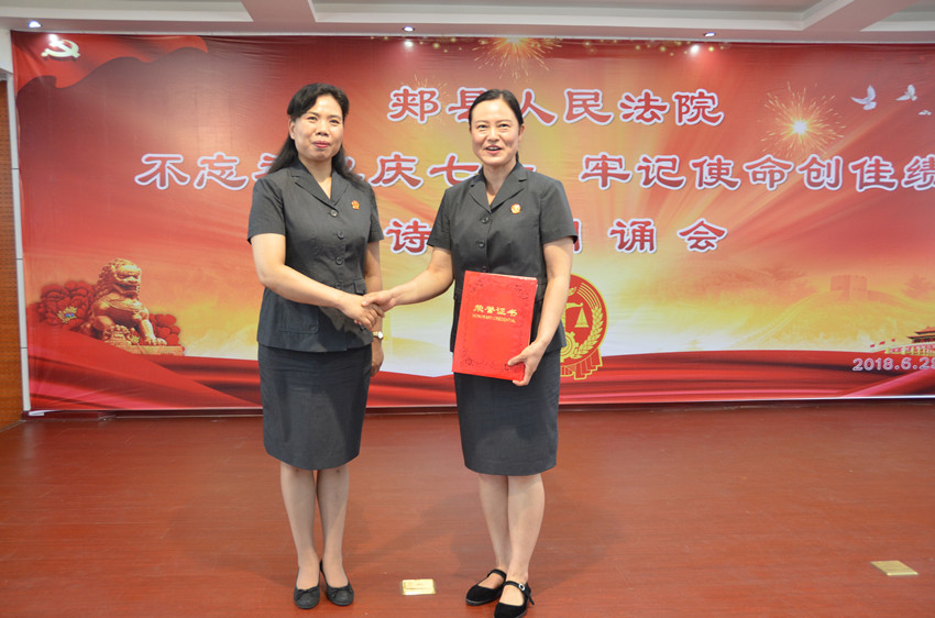为了庆祝中国共产党建党97周年,激发广大干警忠诚履职、爱党敬业的责任感和使命感,6月29日下午,郏县法院举行“不忘初心庆七一 牢记使命创佳绩”诗歌朗诵会。郏县法院党组书记、院长宋景婵出席并发表致辞。郏县县委办常务副主任李彦峰,县文明办主任丁营军应邀观看朗诵会并担任评委。