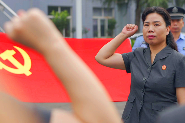 该院党组书记、院长宋景婵带领班子成员面对党旗,举起右拳再次庄严宣誓。“我志愿加入中国共产党,拥护党的纲领,遵守党的章程,履行党员义务……”他们铿锵有力的声音,像在战场上冲锋陷阵的号角,久久回荡在法院上空。看着他们坚定刚毅的面孔,听着他们充满激情的声音,全院干警纷纷表示要坚定理想信念,牢记入党誓言,不忘初心,扎实工作,用实际行动向建党98周年献礼!
