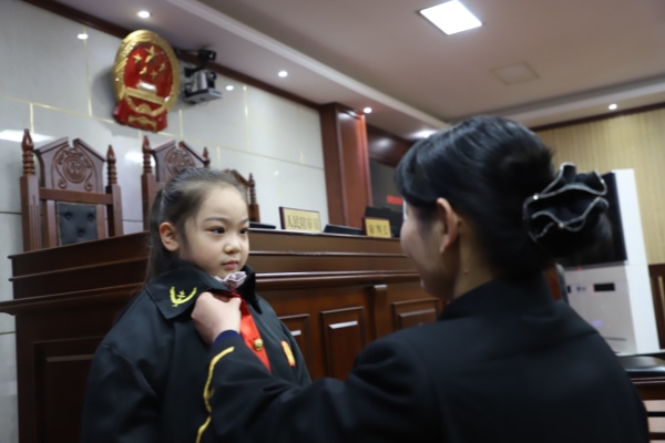 在多功能科技审判庭,讲解人员首先向孩子们介绍了法庭的布局、各个席位的职能,以及法徽、法槌、法袍所代表的意义。随后在法官的帮助下,孩子们依次穿上迷你版的黑色法袍,化身为一个个“小法官”。随着“小审判长”敲响法槌,一场生动活泼、充满童趣的庭审演绎正式开始,孩子们在亲身实践中感受了法律的庄重与威严。